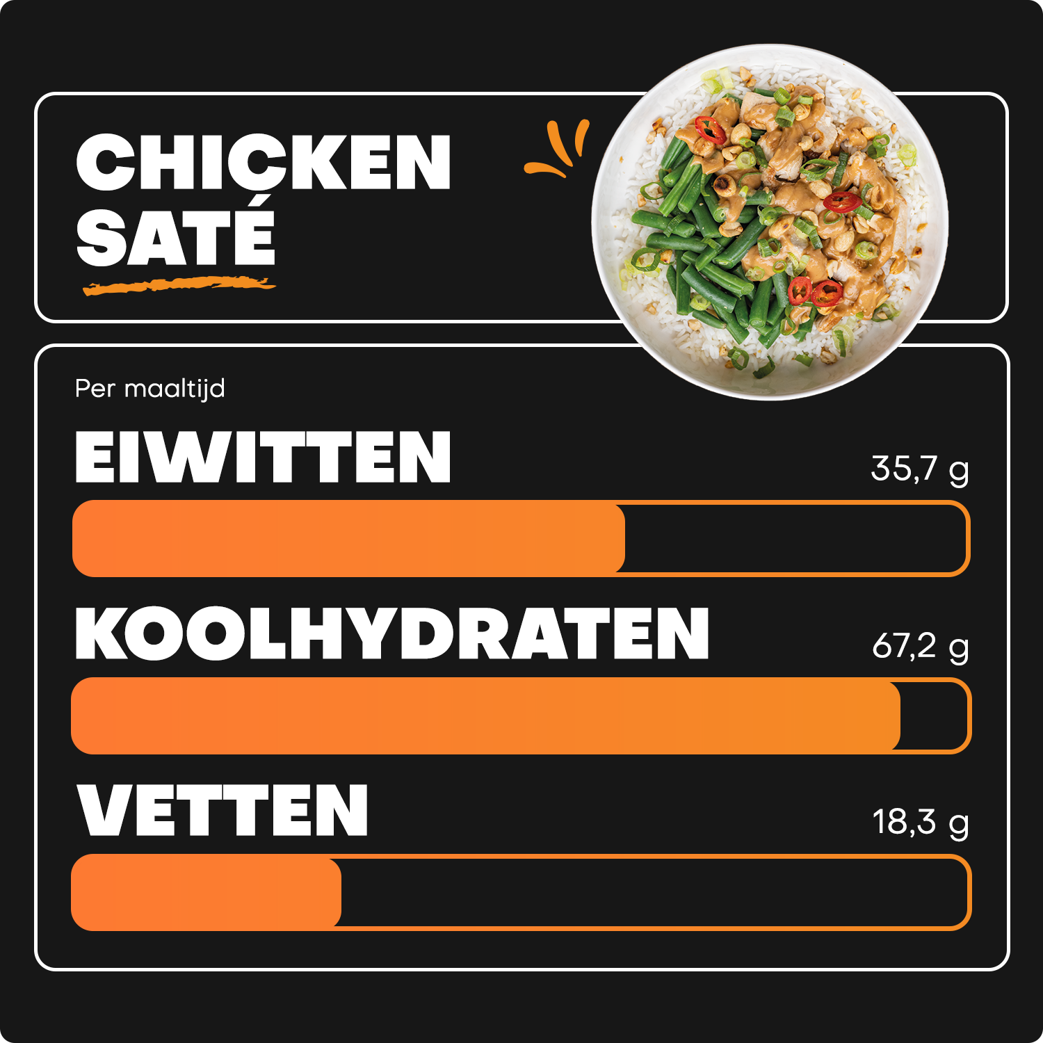 Onze klassieke Chicken Saté is de perfecte maaltijd voor iedereen die graag flink wat uurtjes doorbrengt in de gym en zijn/haar tijd wil besteden aan groeien (in spiermassa!) in plaats van koken. Deze smakelijke en voedzame maaltijd is speciaal samengesteld door een team van professionals om jou te voorzien in de energie die nodig is voor het leveren van topprestaties!