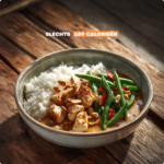 | Ingrediënten: Gekookte rijst 29% (water, geparfurmeerde rijst), prinsessenbonen 28%, geroosterde kip 15% (kip, zout, dextrose), water, kokosmelk (kokosnootextract, water), PINDAnoten pasta 4%, sojasaus (water, SOJAbonen, zout, alcoholazijn), uien, suiker, plantaardige oliën (zonnebloem, koolzaad, in wisselende verhoudingen), bereiding op basis van limoensapconcentraat (water, limoensapconcentraat, citroenpulp, voedingszuur: citroenzuur, limoen extract), gember, gemodificeerd zetmeel, citroengras, knoflook, rode chili, zout, specerijen. |