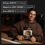 - Airfryer (200 °C – 5-7 min): Verwarm de airfryer voor. Verwarm de maaltijd (zonder deksel) 5–7 minuten in het bakje.